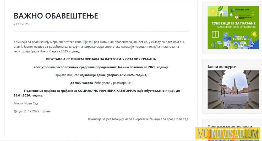 Kao što vidite, prijem prijava za energetsku sanaciju domaćinstva na sajtu Grada Novog Sada, za kategoriju "ostalih građana" obustavljen je zbog utroška raspoloživih sredstava opredeljenih javnim pozivom za 2025 godinu.