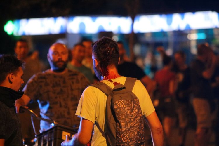 Policija se uglavnom trudila da razdvoji suprotstavljene strane postavljanjem kordona, ali nije sprečavala pristalice SNS-a da bacaju vatromete, flaše itd. Kako možete videti na snimku ispod, malo su i tukli novinare...