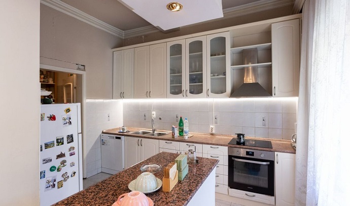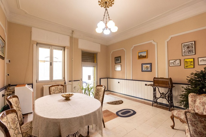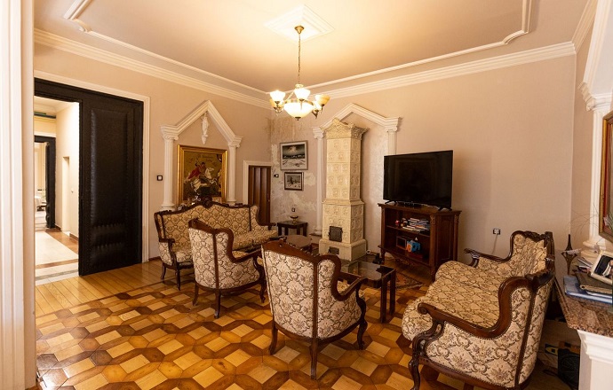 Ulaz sa ulice uvodi vas u prijemnu sobu popločanu mermerom, a zatim kroz ogromna, tapacirana vrata, u salon sa visokim plafonom i podom u mozaik parketu. Prostor odiše harmonijom, a dah prošlih vremena prisutan je na svakom koraku. Tu je i ponosna carica - kaljeva peć, kojoj vreme nije umanjilo eleganciju i lepotu. Salon je povezan sa trpezarijom i diskretno postavljenom kuhinjom. Prostran hodnik vodi vas u spavaću sobu i kupatilo.