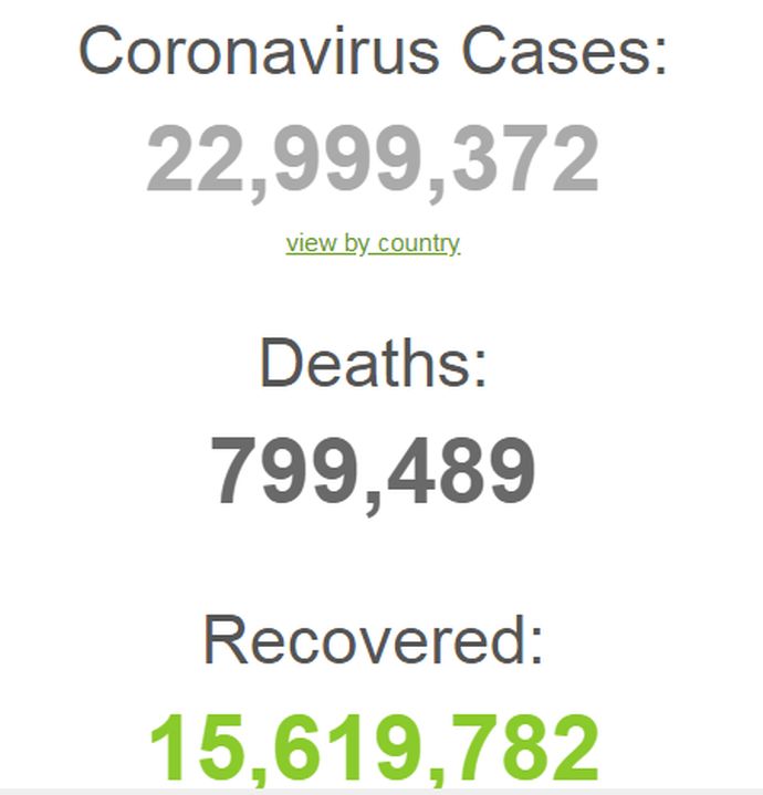 U svetu je korona virusom trenutno zaraženo blizu 23 miliona ljudi, dok je oko 800 hiljada pacijenata preminulo od Kovida-19, objavio je sajt worldometers.info.