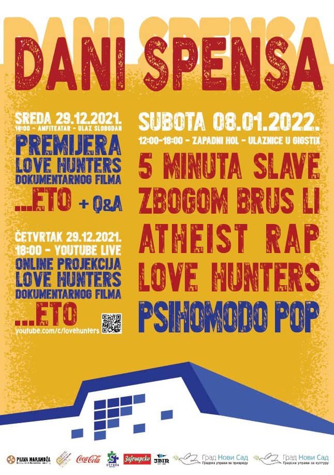 Otvoriće je premijera “netipičnog dokumentarnog filma” o gupi Love Hunters – “…Eto”, koja će biti održana u amfiteatru sa početkom u 18 časova. Ulaz je slobodan, a nakon projekcije, prisutni će moći da postavljaju pitanja članovima benda