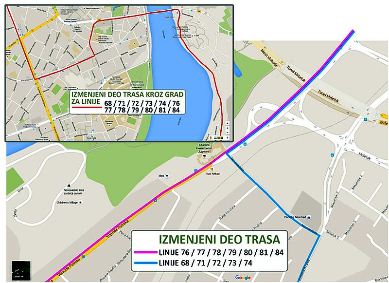 VAŽNA NAPOMENA: Od 18 časova u subotu do 9.30 časova u nedelju navedene linije saobraćaju preko Mosta slobode, s tim što linije 68, 71, 72, 73 i 74 posle tunela na semaforu produžavaju pravo ka fakultetu FABUS, gde skreću levo u Novosadsku ulicu iz koje desno Ulicom doktora Goldmana nastavljaju redovnom trasom. U povratku se koristi ista trasa kroz Novosadsku ulicu, a zatim SVE LINIJE na prvom skretanju desno nastavljaju do tunela i produžavaju za Novi Sad.