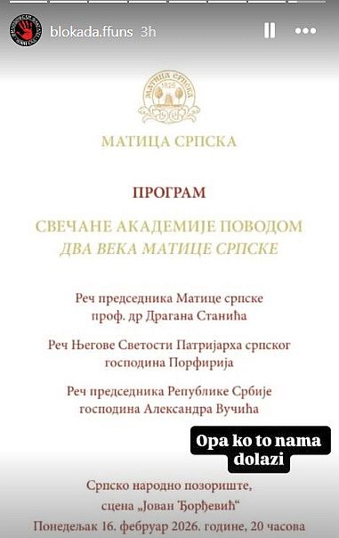 Studenti u blokadi Filozofskog fakulteta u Novom Sadu objavili su ovu informaciju na svojim društvenim mrežama i posebno istakli informaciju da će na svečanosti, pored reči predsednika Matice srpske profesora doktora Dragana Stanića, te patrijarha Porfirija, čuti i reč predsednika republike Srbije Aleksandra Vučića.