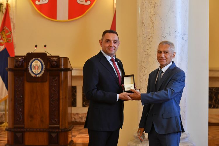 Ambasador Ruske Federacije Aleksandar Bocan-Harčenko uručio je ministru odbrane Republike Srbije Aleksandru Vulinu Spomenicu direktora Federalne službe Ruske Federacije za ostvarenu vojno-tehničku saradnju na današnjoj ceremoniji dodele odlikovanja predstavnicima Ministarstva odbrane i Vojske Srbije povodom 75 godina pobede nad fašizmom, održanoj danas u Velikoj ratnoj sali Starog generalštaba u Beogradu.