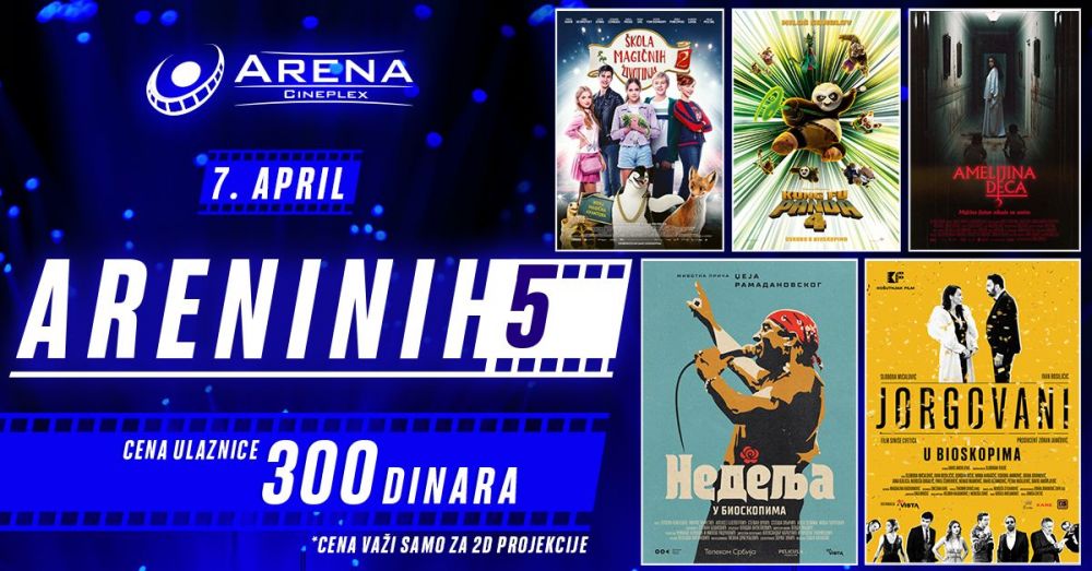 Omiljeni gradski bioskop, Arena Cineplex, nastavlja sa sjajnom akcijom za sve ljubitelje filma. Svaka prva nedelja u mesecu rezervisana je za ARENINIH 5, dan kada odabrane filmove publika može da pogleda po ceni od samo 300 dinara! Ulaznice su u prodaji!