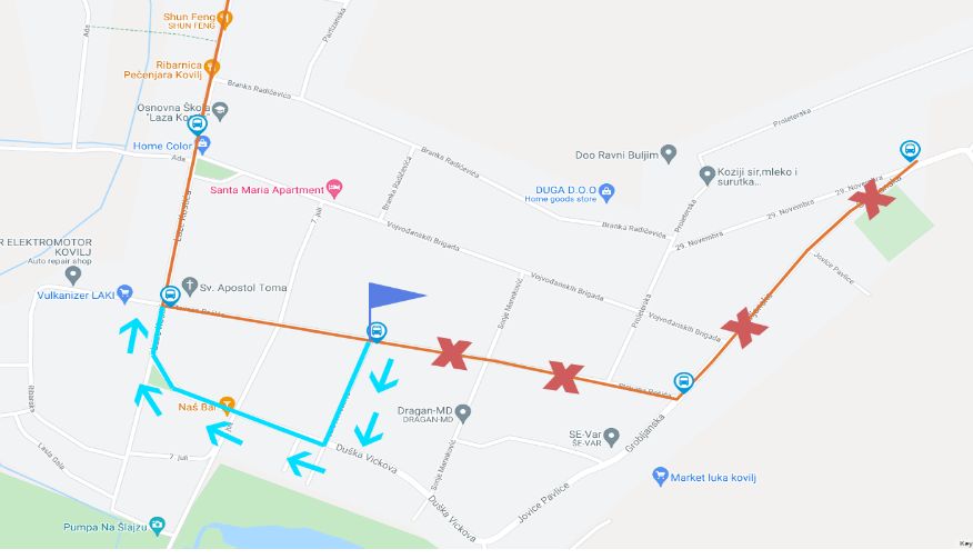 Autobusi iz Novog Sada saobraćaće redovnom trasom do Kovilja, zatim Ulicom Laze Kostića i Ulicom Stevana Pešića, odakle će desno skretati u Ulicu Lale Novoselca gde će biti završno stajalište.