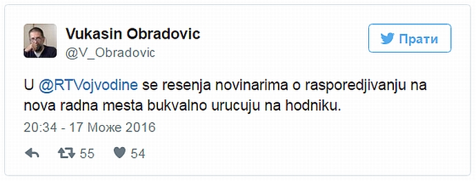 Predsednik NUNS Vukašin Obradović je na svom Tviter nalogu naveo da se “U RTVojvodine rešenja novinarima o raspoređivanju na nova radna mesta bukvalno uručuju na hodniku”.