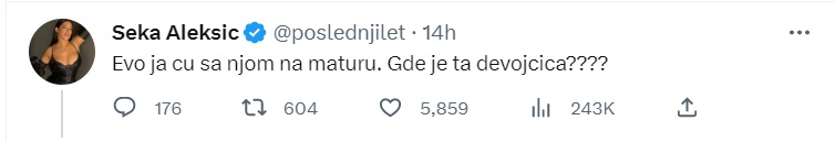 Ali, kako prenosi Nova.rs, do preokreta je došlo kada je pevačica Seka Aleksić saznala za ovaj slučaj i odmah reagovala na Tviteru rečima: “Evo ja ću sa njom na maturu. Gde je ta devojčica?”.
