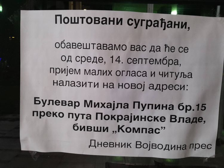 Kada se novosadski “Dnevnik”, posle šest decenija, preselio iz zgrade na Bulevaru oslobođenja 81 u prostorije na Bulevaru Mihajla Pupina 6 (na drugom spratu), informisani smo da se oglasi i čitulje mogu predati na staroj adresi.