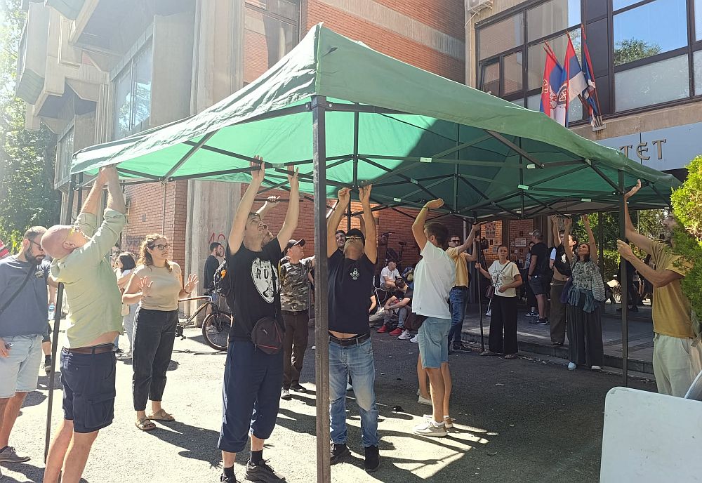 Oko 11 časova, studenti su, uz pomoć građana, postavili tendu ispred ulaza u zgradu i puštaju muziku.