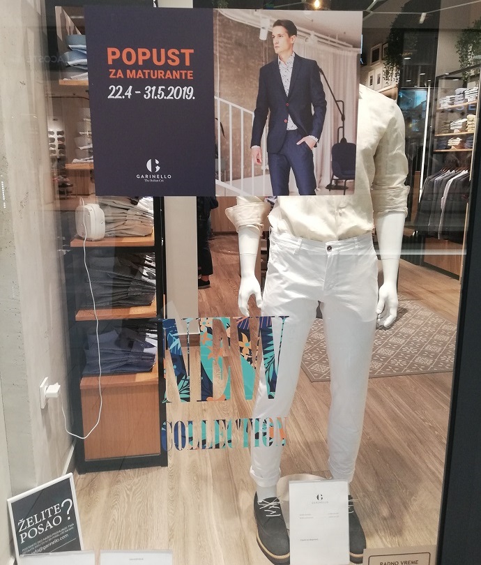 Takođe, posebna ponuda sa popustom može se ostvariti i u butiku Garinello koji nudi muška specijalno dizajnirana usko strukirana odela uglavnom pastelnih boja.