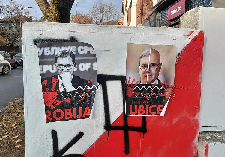 Na jednom na kom se nalazi fotografija predsednika Srbije piše ROBIJA” dok se na drugom nalazi foto-montaža – pola predsednikovog, a pola premijerovog lica i ispod piše “UBICE”.