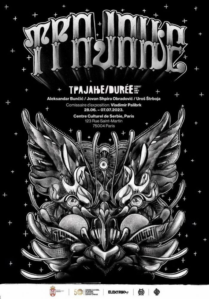 Izložba pod nazivom “Trajanje” koju su 28. juna otvorili predstavnici novosadske street art scene Jovan Špira Obradović, Aleksandar Bunčić i Uroš Štrboja Kulturnom centru Srbije u Parizu predstavlja neku vrstu reprezentativnog uzorka, imajući u vidu da se radi o pionirima ulične umetnosti Novog Sada čiji radovi datiraju još iz 1998. godine.