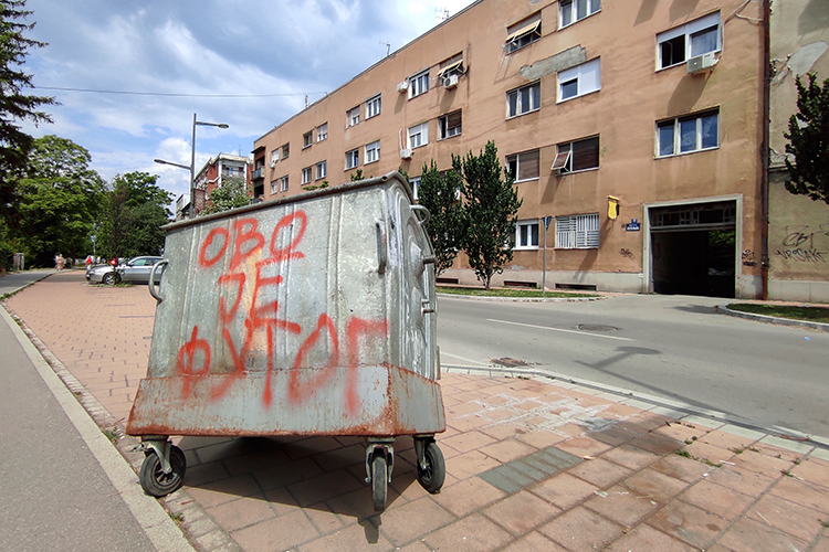 Kontejneri za smeće su takođe u lošem stanju, a jedan koji smo fotografisali na Podbari jedva se drži na tri točkića. Sudeći prema natpisu išaranom sprejom, izgleda je zalutao iz Futoga, ili je neko od Futožana hteo da “proširi” svoju teritoriju.