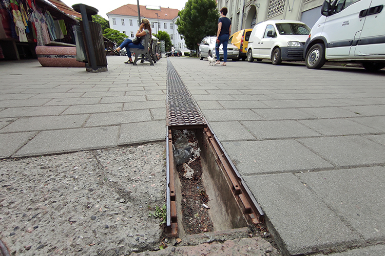 Odvaljeni delovi odvoda za vodu na pločnicima širom centra nisu retka slika, a mi smo ovekovečili jedan u blizini Riblje pijace. Ovakve rupe su potencijalno opasne za prolaznike, bilo da su u pitanju deca, starije osobe ili neko ko ne primeti oštećenje.