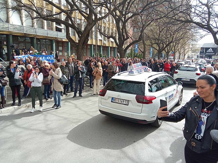 Ulaz u sud čuvaju policajci, a podršku prisutnima pružili su i članovi SOS taksija koji su prošli trubeći pored suda. Prisutni su ih pozdravili aplauzom.