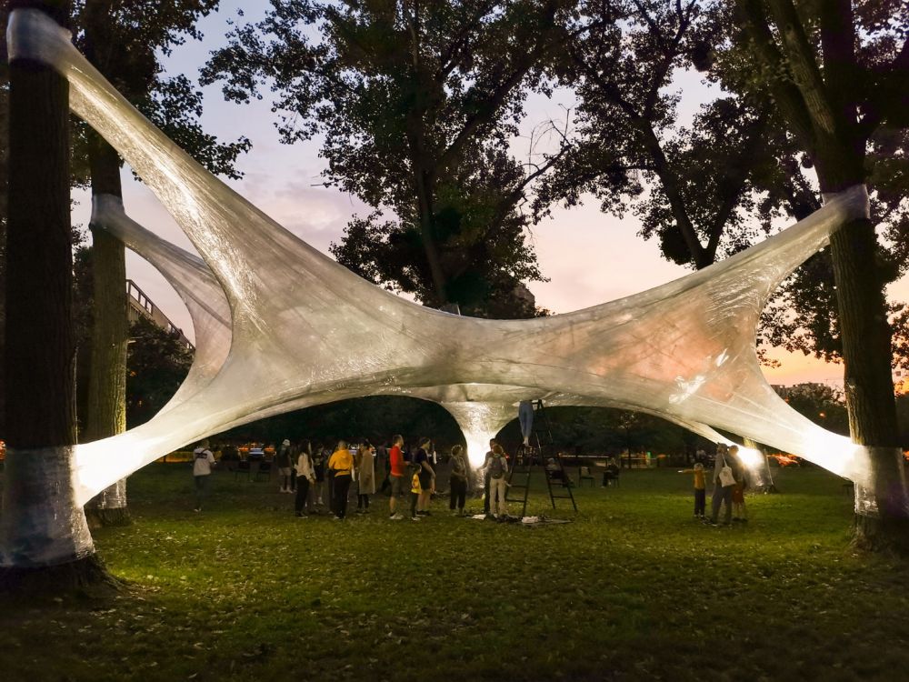 – U osnovi, to je jedna struktura koja je parazit i stvorena je samo od najobičnijeg selotejpa koji se mota, u ovom slučaju, oko drveća i stvara jedan oblik koji liči na čauru. To je jedan bazičan način rada i stvaranja naseobine kao što životinje to rade. To je čisti ručni rad, nema nikakvog prisustva tehnologije – kaže Jonke.