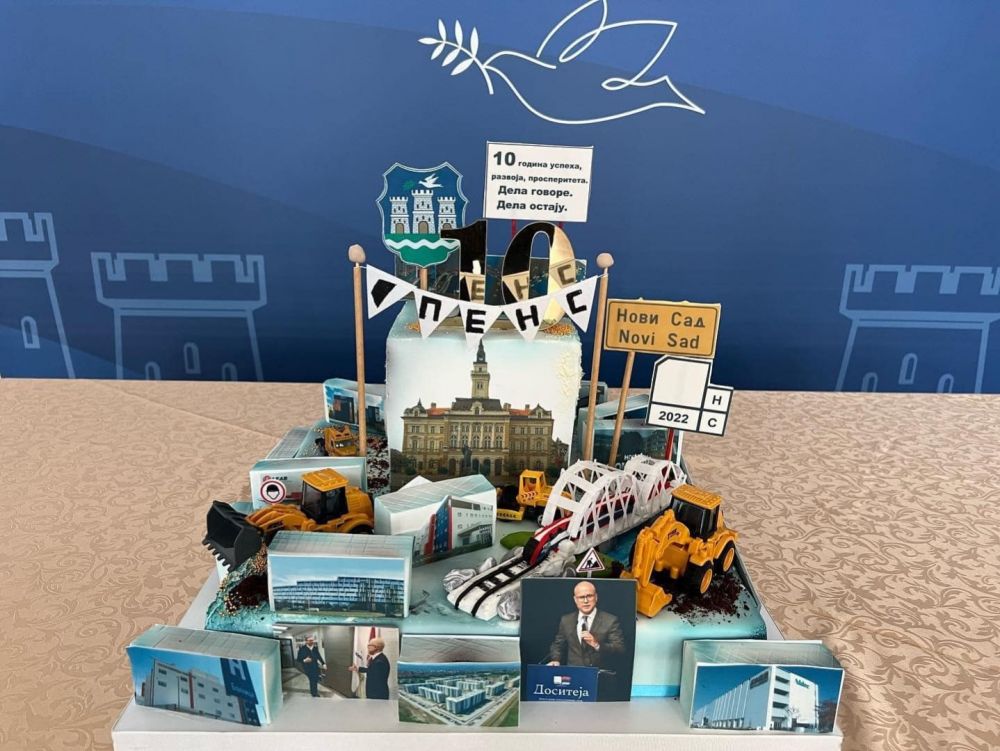 – Deset godina uspeha, razvoja, prosperiteta. Dela govore! Dela ostaju! – bio je kratak komentar uz fotografije slavljeničke torte na kojoj se nalaze bageri, železnički most, fotografija Vučevića, zastavica OPENS, oznake EPK2022, Kovid bolnica na Mišeluku, fabrika Lir, zgrade za bezbednjake na Jugovićevu, baletska škola i drugi objetki koji su obeležili poslednjih 10 godina u Novom Sadu.