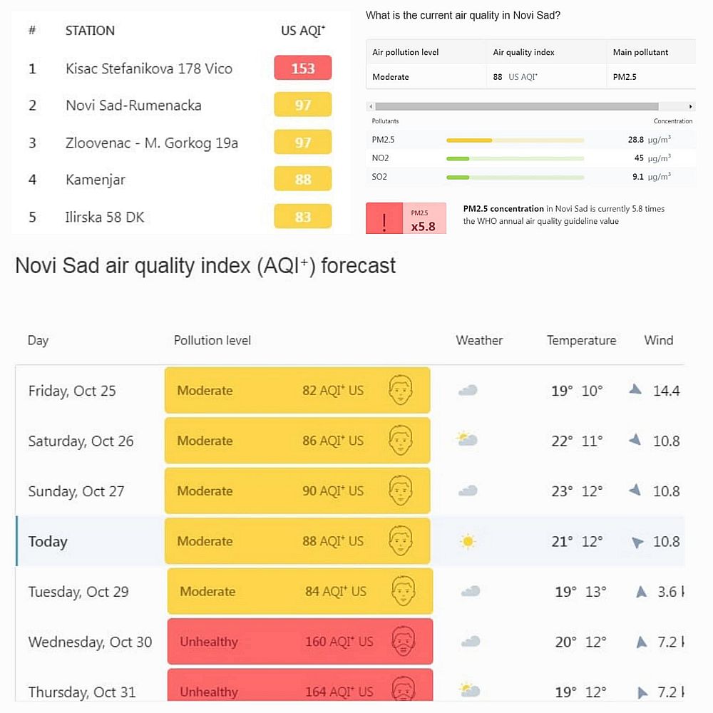 Na sajtu IQ Air trenutno (ponedeljak, 28. oktobar, oko 10 sati) možemo videti da je vazduh najzagađeniji u Kisaču dok je u Novom Sadu koncentracija čestica PM2,5 izuzetno povišena.