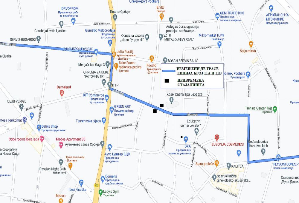 Od raskrsnice ulica Jovana Cvijića i Temerinske autobusi će skretati desno u Temerinsku, zatim levo u Almašku, nastavljati Ulicom Pavla Stamatovića do Kosovske, skretati desno u Kosovsku ulicu i dalje saobraćati redovnom trasom kretanja.