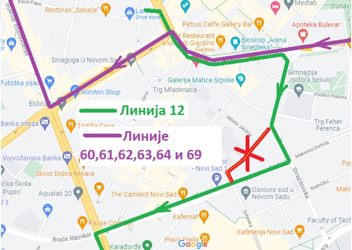 Smer Centar-Telep: Od raskrsnice Žarka Zrenjanina/Vojvođanskih brigada, autobusi će saobraćati Stražilovskom ulicom, skretati desno u Ulicu Maksima Gorkog i dalje nastavljati redovnom trasom.