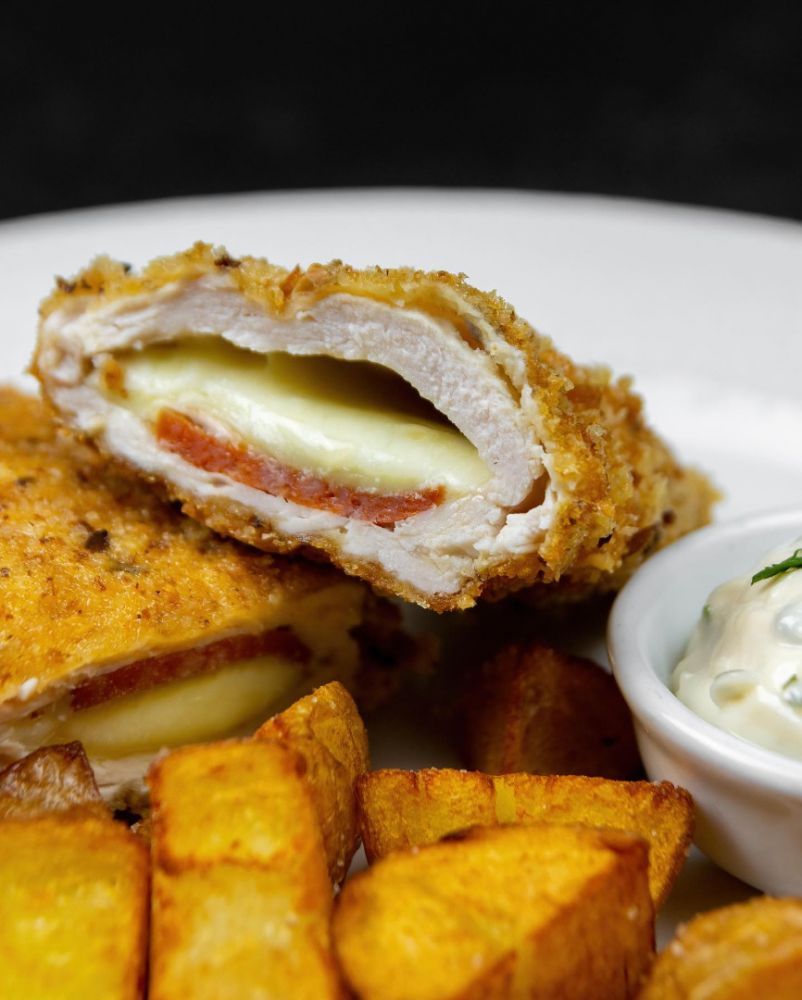 Pored klasične pileće ili teleće bečke, na meniju su i pileća punjena, teleća punjena, sremska bečka (sa kulenom i kačkavaljem), planinska bečka (sa fetom i slaninom), cappricciosa (sa kačkavaljem, šunkom, šampinjonima i origanom) i quattro formaggi (sa kačkavaljem, edamerom, plavim i dimljenim sirom). Uz njih dobijate i prženi krompir sa nekim od soseva, a možete naručiti i krompir, waldorf ili vitaminsku salatu.