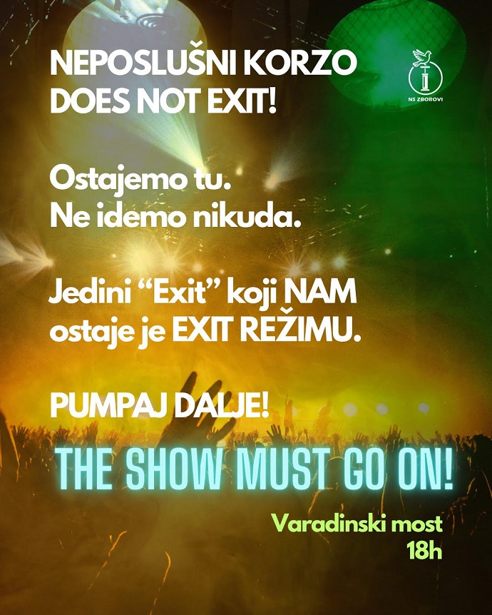 − “Neposlušni” korzo does not Exit. Ostajemo tu. Ne idemo nikuda. Jedini “Exit” koji nam ostaje je Exit režimu. Pumpaj dalje. The show must go on – poručili su Novosađani.