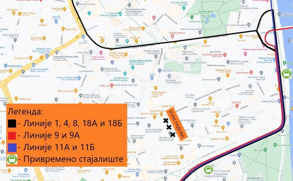 Na linijama broj 1, 4, 8, 9, 9A, 11A i 18B, pored postojećih stajališta drugih linija, koristiće se privremena stajališta na Bulevaru cara Lazara – ispred Tehnološkog fakulteta i privremeno stajalište na Keju žrtava racije – Maksima Gorkog.
