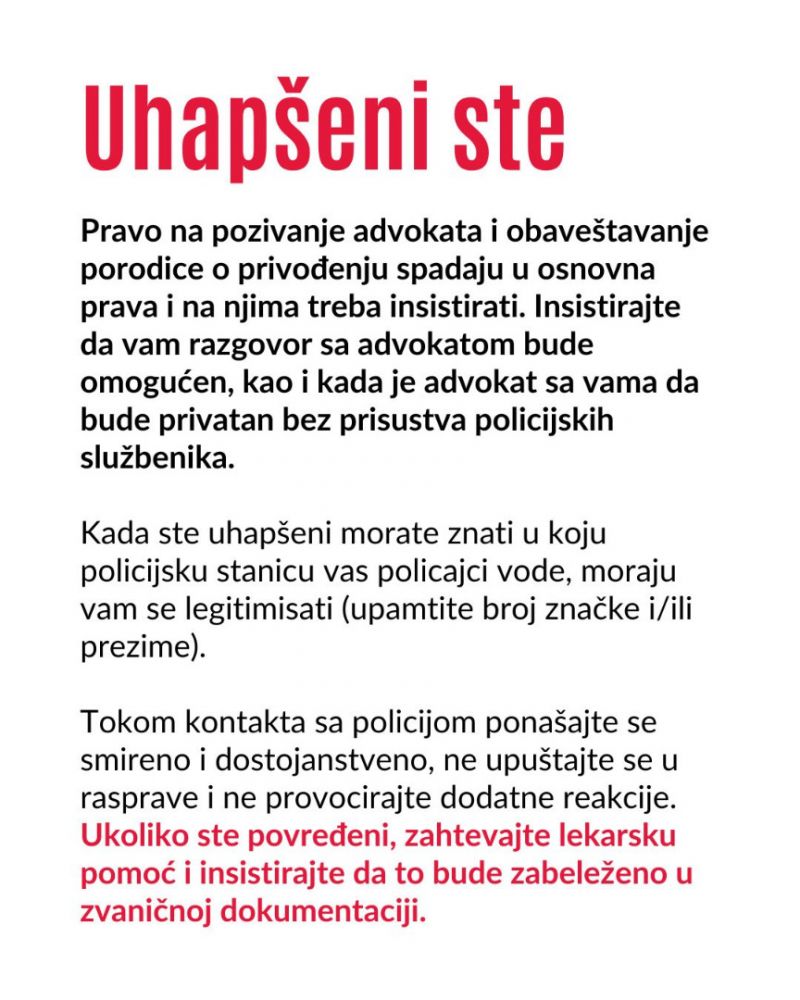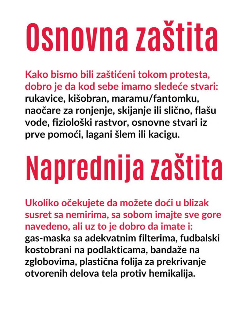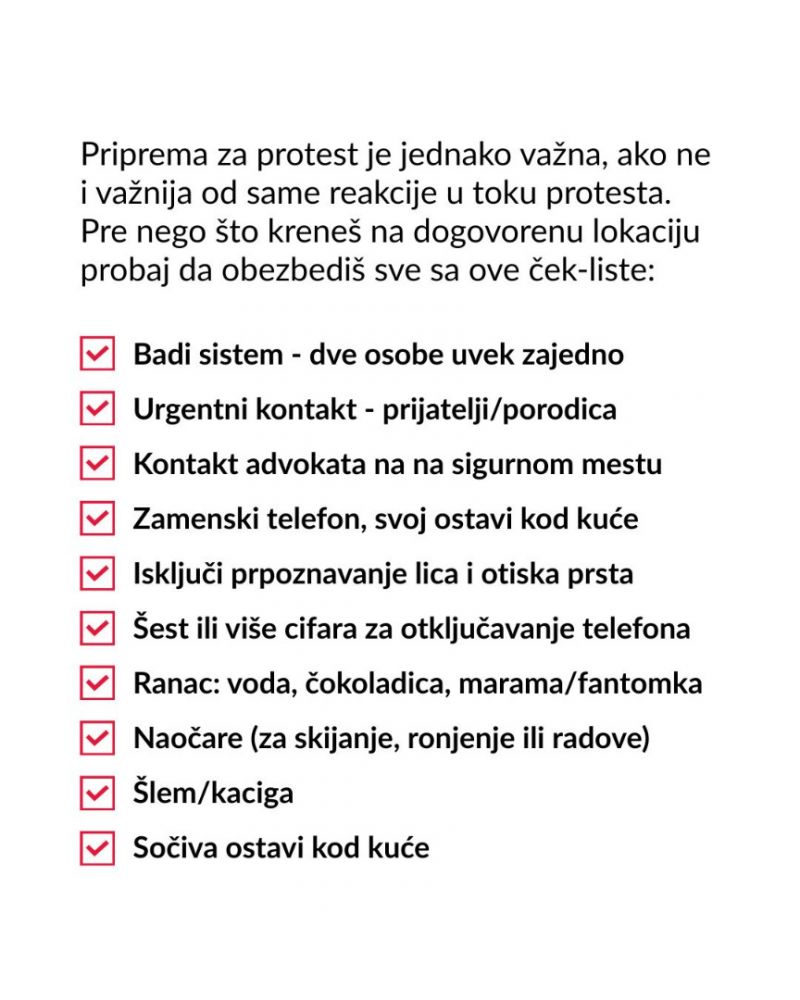 Pred svaki veliki protest, posebno ako ima i najmanju šansu da preraste u nemire, jako je važno da budete spremni i dobro pripremljeni: pravno, fizički, digitalno i kako da zaštitite svoj identitet i podatke, poručuju oni.