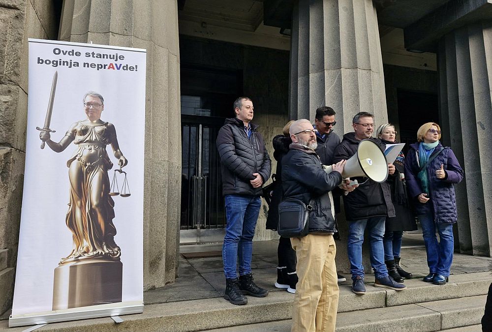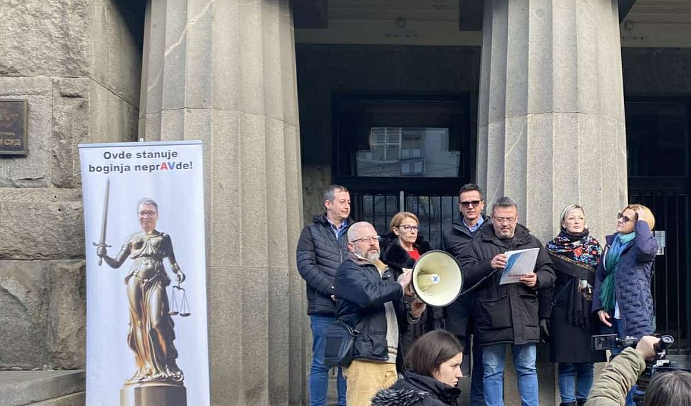 Članovi Glavnog odbora NSPRS su ispred zgrade Ustavnog suda postavili rolap na kojoj je fotomontaža glave predsednika Republike Srbije i tela boginje pravde Justicije, s naslovom “Ovde stanuje boginja neprAVde”.
