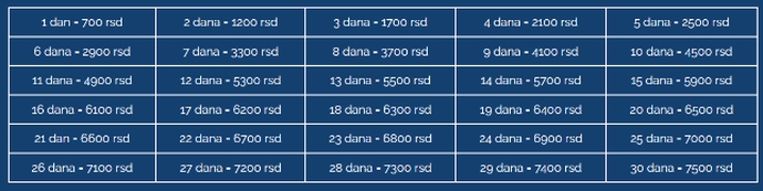 Cenovnik Sky parkinga pogledajte u tabeli. U tabeli se nalazi ukupna cena usluge za određeni broj dana. Za period od 30 i više dana, cena po danu je 200rsd.
