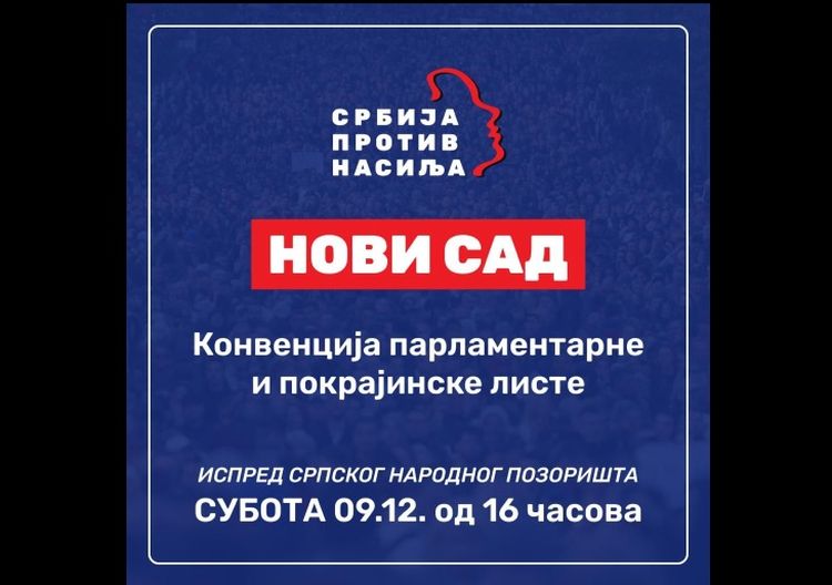 Konvencija parlamentarne i pokrajinske liste “Srbija protiv nasilja” održaće se u subotu, 9. decembra, u Novom Sadu.