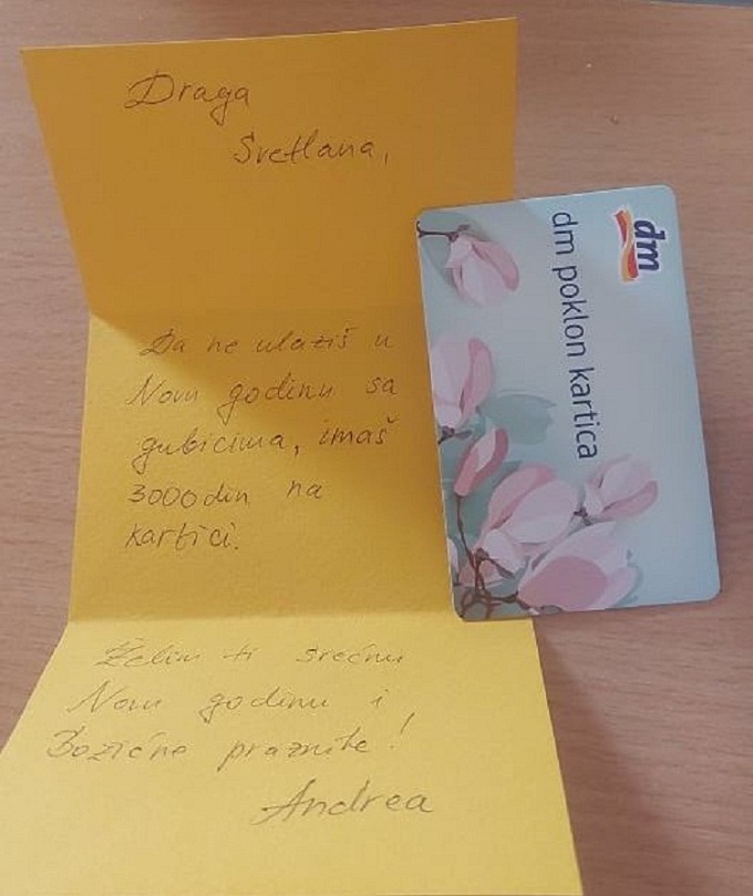 “Ovim putem želim da obavestim moj grad da ne treba gubiti veru u ljude. Naime desilo mi se da sam opljačkana u autousu 7 kod Železničke stanice. Samo jednu stanicu je dotični iskoristio videvši me na stakama da sam ušla u autobus. Vešto izvadivši novčanik i počastio se za Novaka… Sutradan devojka u tom komšiluku nalazi novčanik bačen ispod kola i srećom uspemo da se nadjemo oko preuzimanja istog sa svim dokumentima. Da bih ja sada uspela da pregledam na miru novčanik. Našla sam poruku sa poklon karticom od DM-a… Nemam reči, u neverici sam da je još dobrih ljudi u ovom gradu. Draga Romanić Andrea od sveg srca ti želim da imaš sreće i zdravlja. Sve najbolje u životu ti želim. Ovim putem ti se javno zahvaljujem za ovaj gest dobročinstva. Verjte u dobro jer ono i dalje postoji. Još jednom draga Andrea hvala ti na svemu.”, piše u Svetlaninoj objavi.