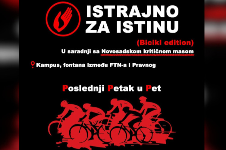 Poslednjeg petka u januaru, 31. januara, u 17 časova, u kampusu Novosadskog univerziteta okupiće se biciklisti, skejteri, roleraši, monociklisti i svi oni koji svojim prevoznim sredstvima ne zagađuju okolinu, kako bi svi zajedno podržali zahteve studenata i pozvali novosadske bicikliste i širu javnost na blokadu na tri novosadska mosta 1. februara.