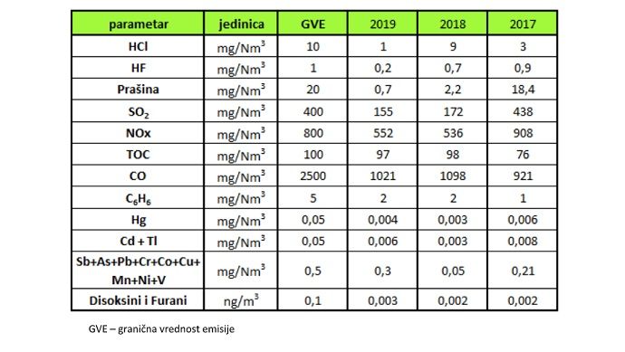 Dostavljena nam je i tabela koja prikazuje objedinjene rezultate merenja od ovlašćene stručne organizacije za prethodne tri godine na lokaciji dimnjaka rotacione peći gde se koriste alternativna goriva prema postojećim dozvolama.