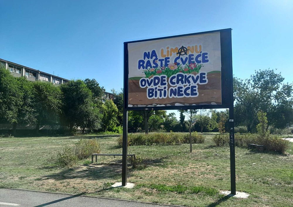 Stanovnici Limana okupljeni oko zborova su na dve lokacije na Limanu jedan izlepili bilborde sa porukom “Na Limanu raste cveće, ovde crkve biti neće”.