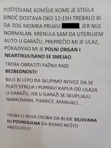 U pitanju je zgrada na uglu Đorđa Rajkovića i Marka Miljanova , Podbara. Juče ujutru (17. 2) nas je dočekalo obaveštenje na vratima ulaza.