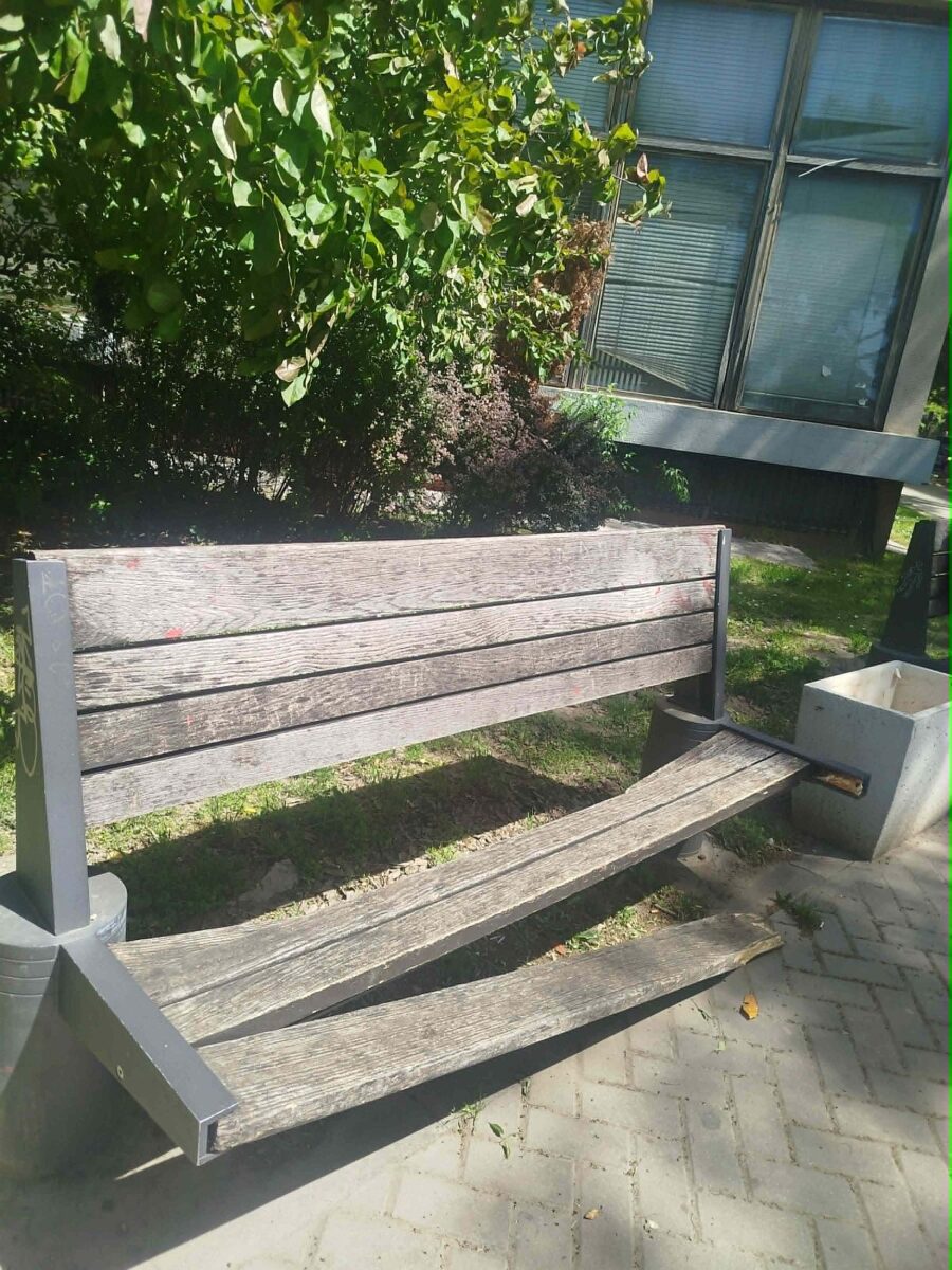 Pored toga što je prethodnih dana polomljena, po njoj se vidi da, iako nije iz najstarije generacije NS klupa, nije uopšte održavana što bi trebalo da bude obaveza, ili Grada ili onih koji su te klupe postavljali.