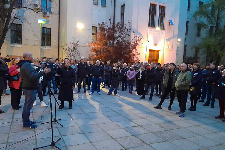 U dvorištu Elektrotehničke škole večeras su se okupili roditelji, profesori, đaci i građani dobre volje, kako bi podržali profesore povodom odluke direktora škole o onlajn nastavi.