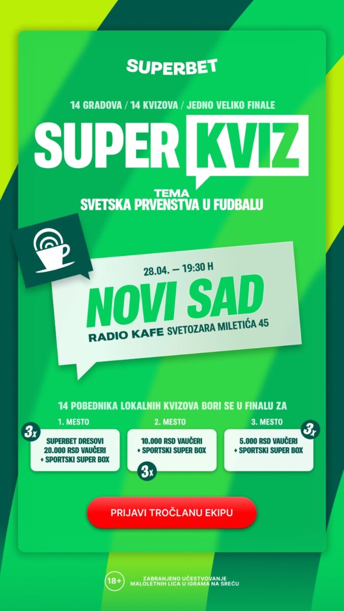 Za početak, potrebno je prijaviti ekipu od tri punoletna člana putem linka: https://lp.superbet.rs/lp/super-kviz-2026. Odaberite Novi Sad, usaglasite se sa opštim