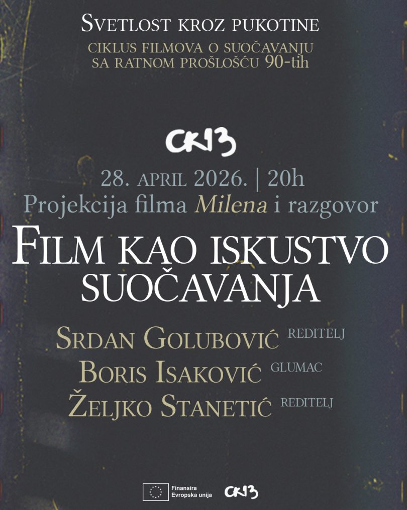 U okviru ciklusa filmova o suočavanju sa ratnom prošlošću devedesetih “Svetlost kroz pukotine”, u utorak, 28. aprila, nakon projekcije kratkometražnog igranog filma „Milena“ (Željko Stanetić, 2024), biće održana tribina pod nazivom „Film kao iskustvo suočavanja“.