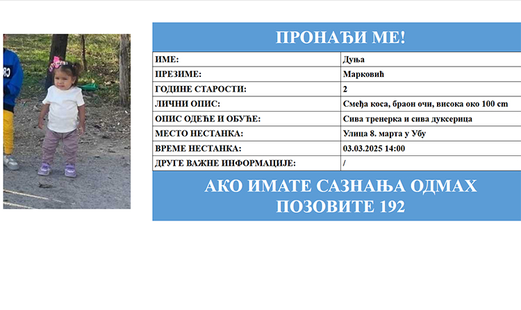 Devojčica Dunja Marković, stara dve godine, nestala je u ponedeljak 3. marta oko 14 sati u Ubu, navodi se na sistemu Pronađi me.