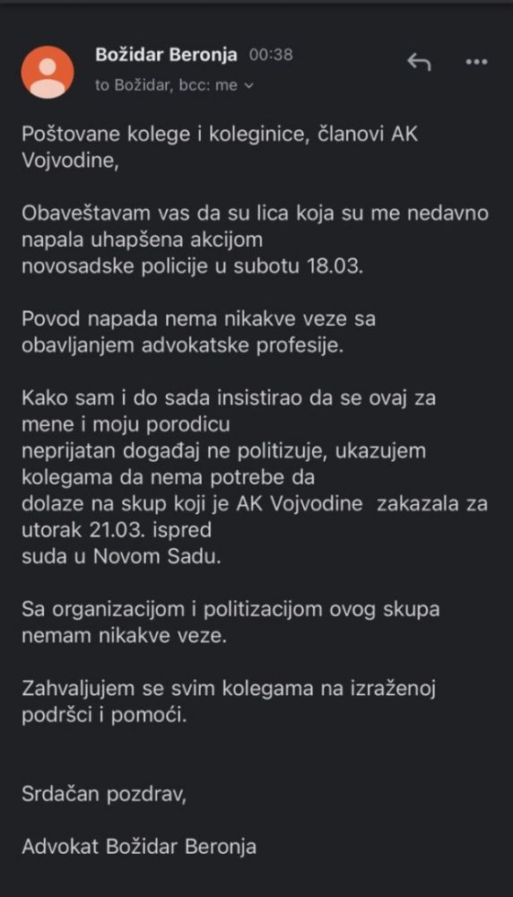 – Ovim putem Vam se obraćam sa obaveštenjem da je neko u moje ime na mailng listu advokata poslao mail koji vam u prilogu dostavljam i u kome se navodi da pozivam kolege da ne prisustvuju protestu koji organizuje Advokatska komora Vojvodine u utorak 21.03.2023.g. u 12h ispred zgrade suda u Novom Sadu jer su počinioci napada na mene privedeni – objašnjava Beronja i dodaje:
