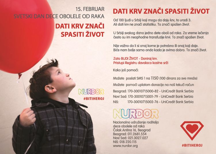 Nacionalno udruženje roditelja dece obolele od raka – NURDOR, organizovaće skupove na trgovima, glavnim ulicama i šetalištima u više od 20 gradova širom Srbije. Ovom prilikom će za sve zainteresovane biti omogućeno dobrovoljno davanje krvi i pristupanje u registar davalaca kosne srži.
