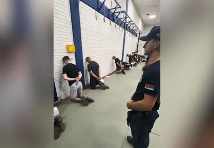 Više režimskih medija objavilo je snimak, za koji piše da je od MUP-a Srbije, na kom se vide muškarci, mahom mlađi, kako kleče, dok su im lisice na rukama, a čela pribijena uz zid.