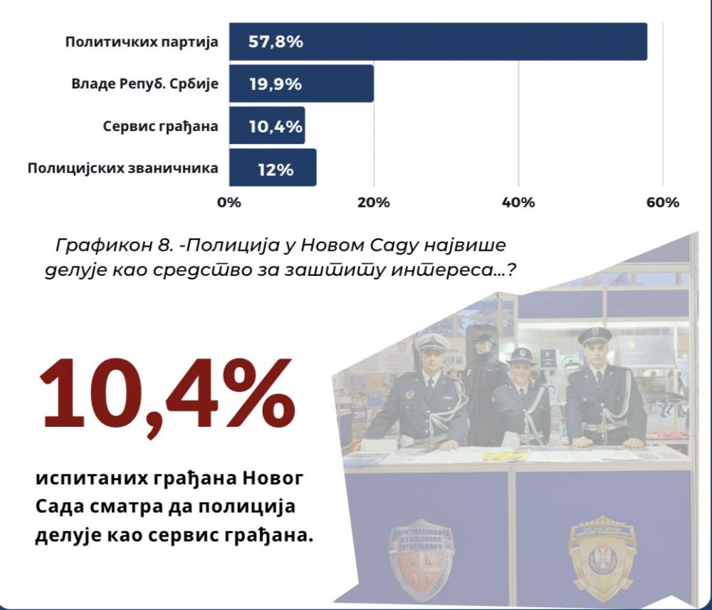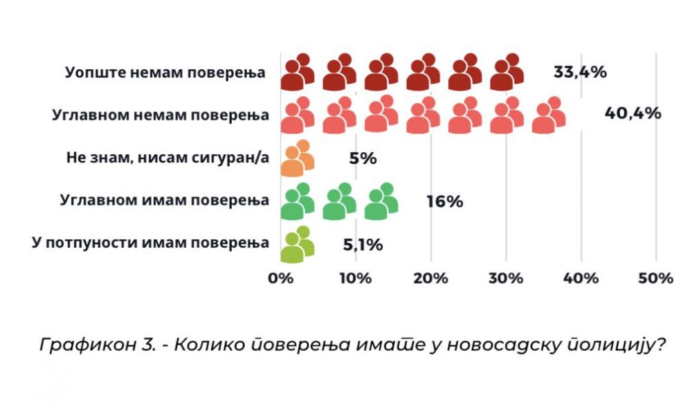Čak 64% građana ocenjuje bezbednosnu situaciju kao nebezbednu, 94 odsto naših sugrađana smatra da političari imaju neki vid uticaja na operativni rad policije, 81% je izjavilo da je korupcija prisutna u velikoj meri, 10 procenata njih da novosadska policija deluje kao servis građana dok čak 74 posto novosađana nema poverenja u policiju.