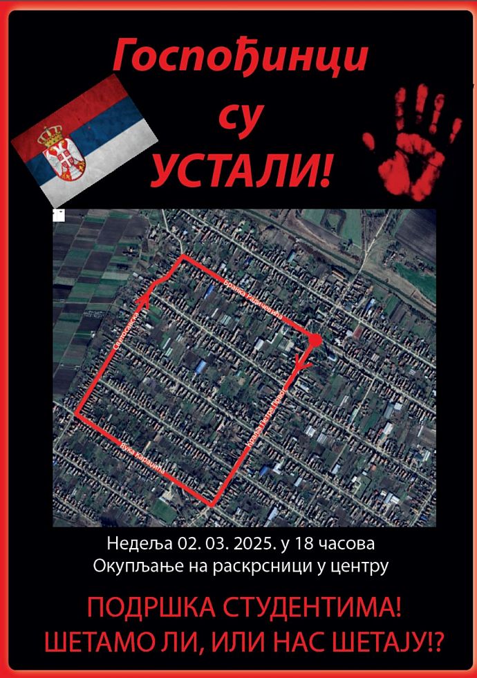 – Samoinicijativna grupa mladih iz Srbobrana poziva na protestnu akciju – pešačenje iz Turije do Srbobrana, blokadu raskrsnice na sat vremena i protestnu šetnju po Srbobranu. Skup u Turiji je od 14 do 14.30h, nakon toga se kreće peške za Srbobran. Pešake iz Turije dočekujemo u 16.30h, ukoliko bude sve po planu, na raskrsnici kod Pošte, gde sledi jednočasovna blokada. Pozivamo sve ljude dobre volje da pripreme hranu, tople napitke i vodu, kako bismo dočekali pešake iz Turije. Nakon blokade raskrsnice, u 17.30h, kreće se u protestnu šetnju po Srbobranu.Pokažimo solidarnost, istrajnost i upornost! – saopštili su na Instagram profilu Srbobran se budi.
