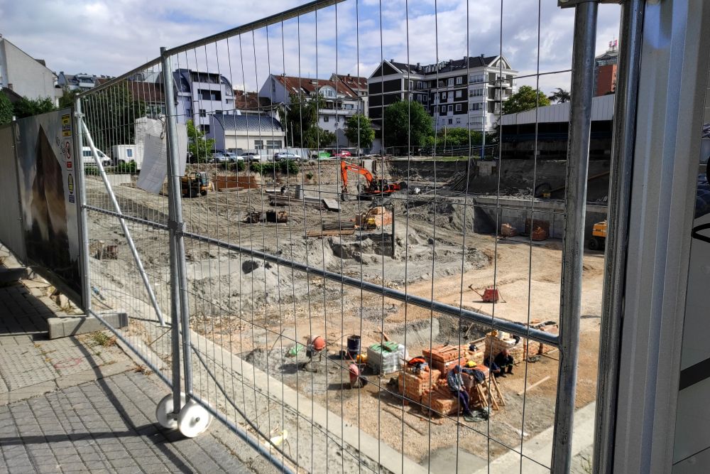I, na samom uglu, do Spensa, lepu kvadraturu zauzelo je poveće gradilište, na čijoj površini “City gradnja” pravi stambeno-poslovni kompleks. Pesak, cigle, kamene blokove i dizalice uskoro će zameniti glanc nova zgrada sa tamnim staklima i crvenom fasadom, koja će gledati direktno na sud.