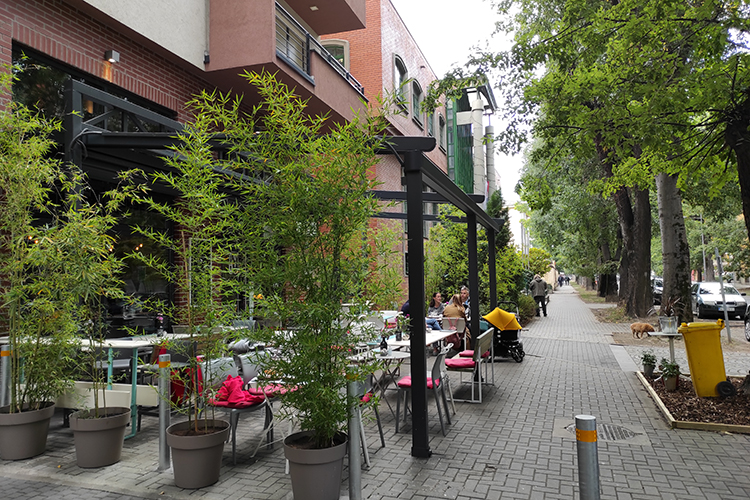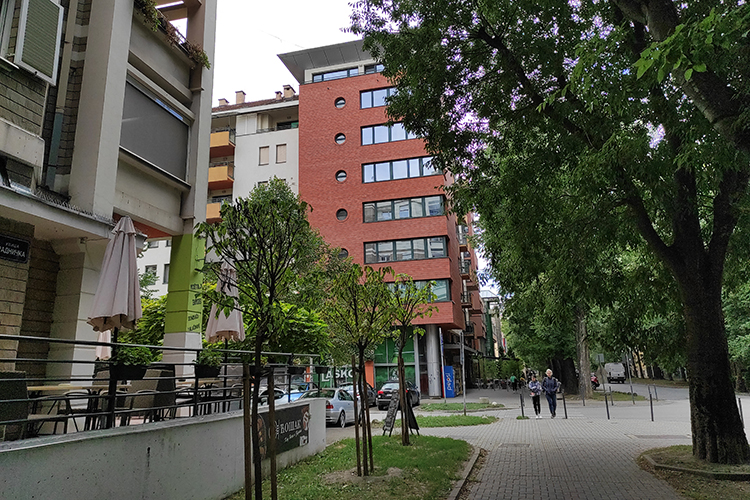 Kafe “Ambiente” prijatan je kutak za popiti kafu, piće ili pojesti neki od sendviča iz ponude, a iza njega se ređaju stare zgrade, od kojih mnoge imaju parkiće ispred. Tako se ova strana Radničke ulice i završava, sve dok ne ugledamo obrise reke.