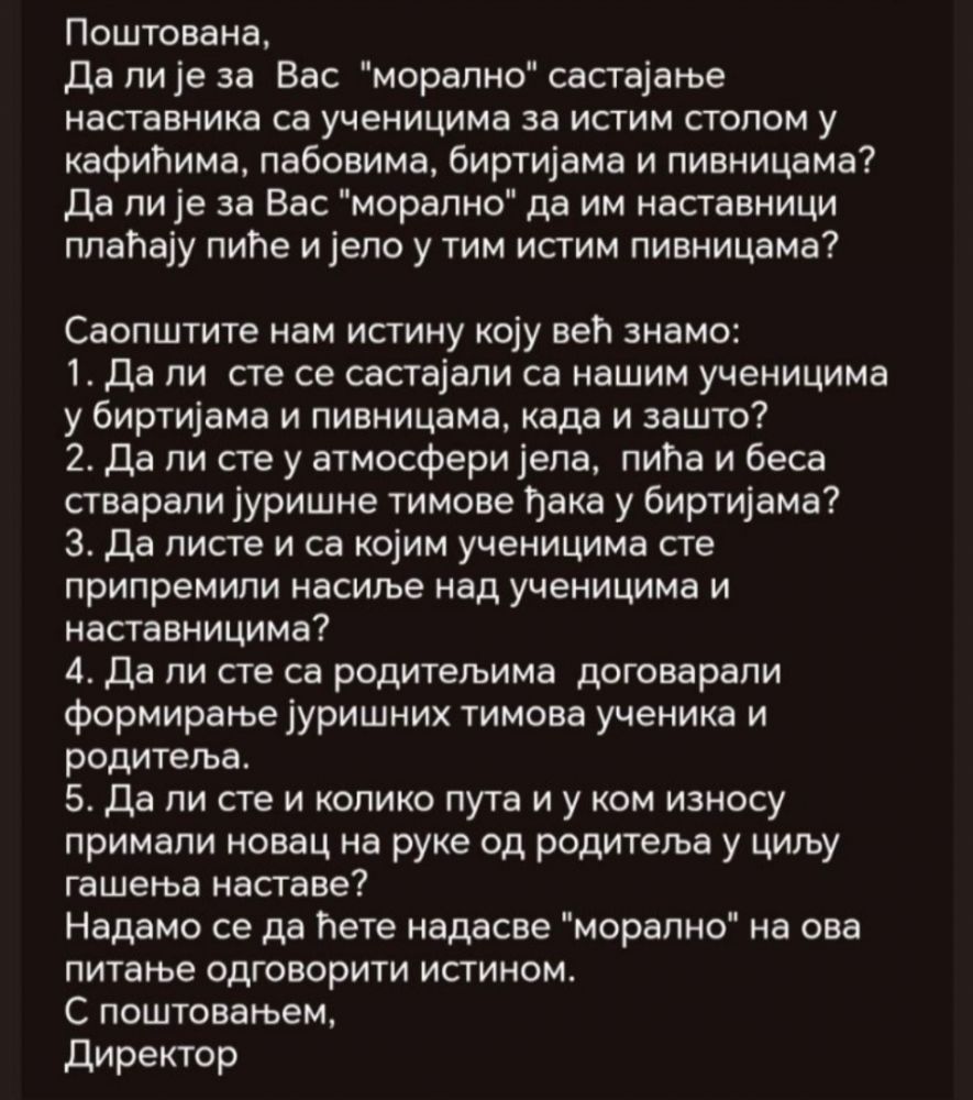 – U formi retoričkih pitanja, Stojković, između ostalog, tvrdi da se koleginica sastajala sa učenicima u birtijama i da je tamo sa njima pripremala nasilje nad učenicima i nastavnicima, kao i da je primala novac na ruke od roditelja u cilju gašenja nastave. Naravno, direktor nijednu od ovih skandaloznih tvrdnji nije potkrepio bilo kakvim dokazom, niti je ove slučajeve prijavio policiji ili bar pokrenuo disciplinski postupak, a o svojim tvrdnjama nije čak izvestio ni Savet roditelja. Shodno tome, ovaj mejl se ne može shvatiti drugačije nego kao čin klevete i blaćenja profesorke koja je pre toga upozorila direktora na neprimerenu komunikaciju sa zaposlenima. Posebno je problematično što su svi učenici, od kojih je najveći broj maloletan, dobili ovaj mejl neprimerene sadržine, u kome se targetira i kleveta njihova profesorka, ali i neimenovani učenici i profesori, pa čak i roditelji – piše u saopštenju.